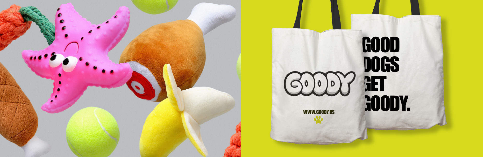 It started with one dog. One day our company dog, Yogi, was visiting our office and we noticed how many different items are used to keep him safe and entertained—toys, dog treats, food bowls—lots of stuff! So Goody was created, an all-in-one dog care package with a handpicked selection of fun toys and pup essentials to keep your dog endlessly happy. Whether it's a present for a friend, a curated welcome gift or just a treat for your four-legged companion—Goody is a pawsome way to show some love!