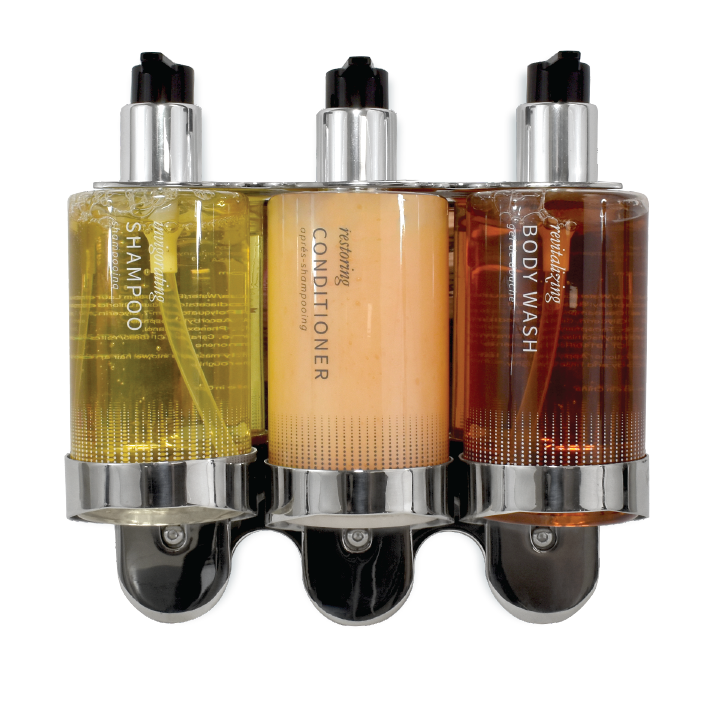 A steel frame provides a sturdy and tamper-proof sanitary option that only housekeeping could unlock with a special key. The standard wall bracket dispenser is fully customizable and easily refillable.